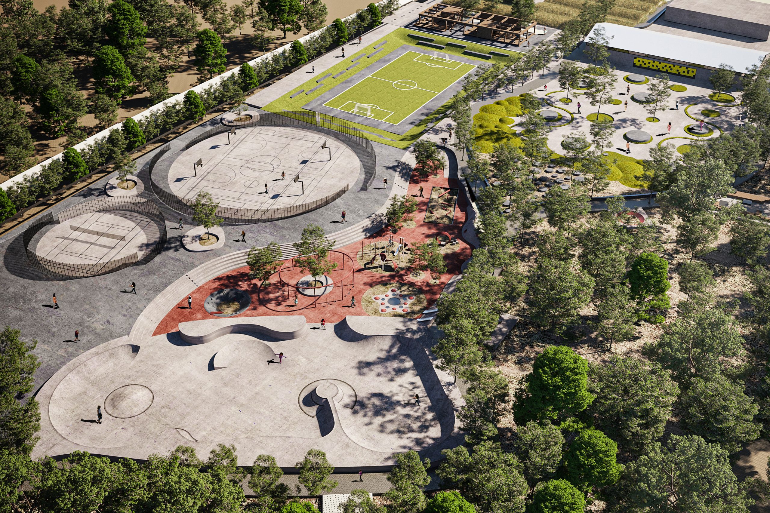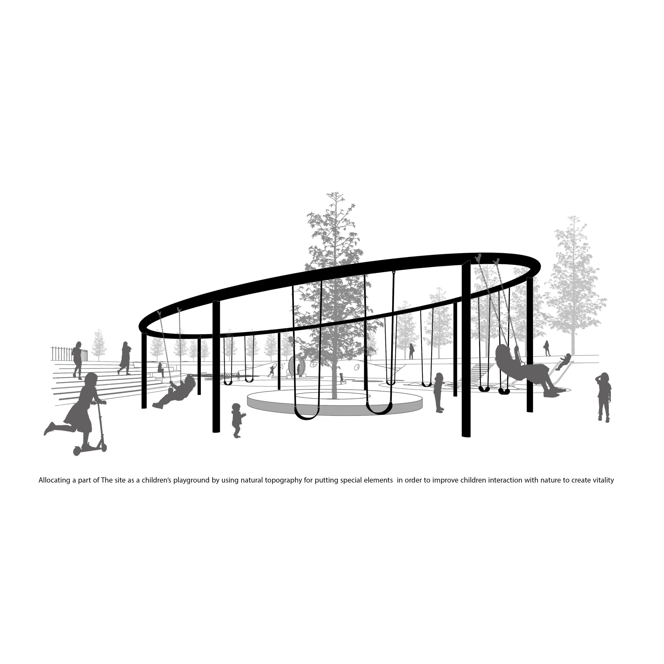 In the eastern section of the site, a centralized space was created due to its separate and desirable access, as well as the allocation of the site to sports fields in the first phase of the project. The aim was to include various sports areas such as volleyball, basketball, tennis, skateboarding, and playgrounds, with the vision to turn Bostan into the largest women’s sports campus in Tehran. Moreover, a part of this sports complex has been reserved for a children’s playground. The natural features of the site, including its topography, have been used to design the playground, and special elements have been incorporated to enhance children’s interaction and coexistence with nature. An atmosphere that is lively and engaging has been created in this section of the site, with a focus on all age groups.