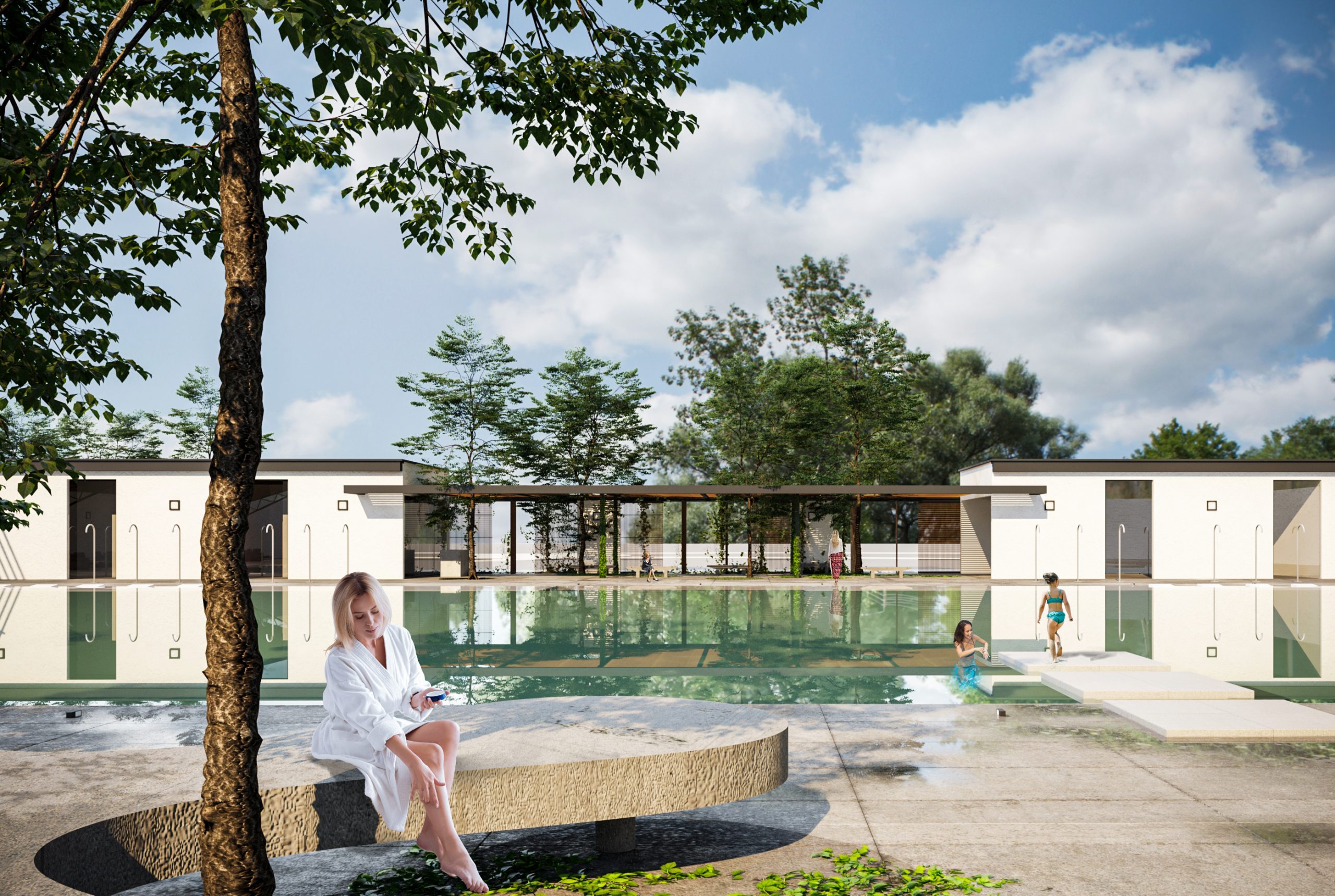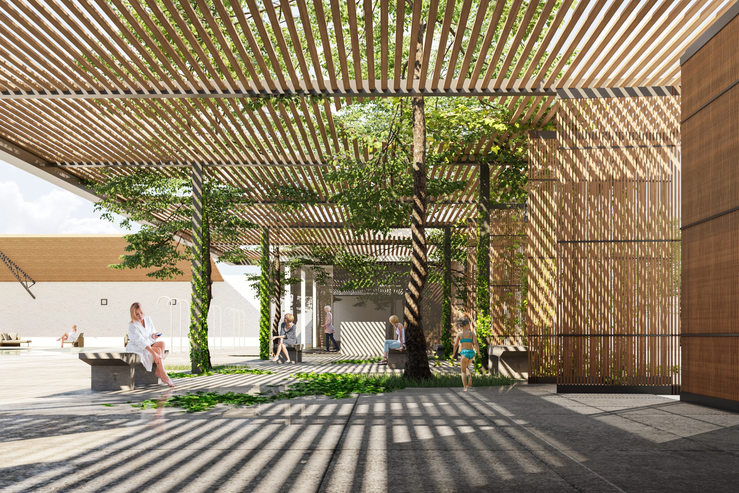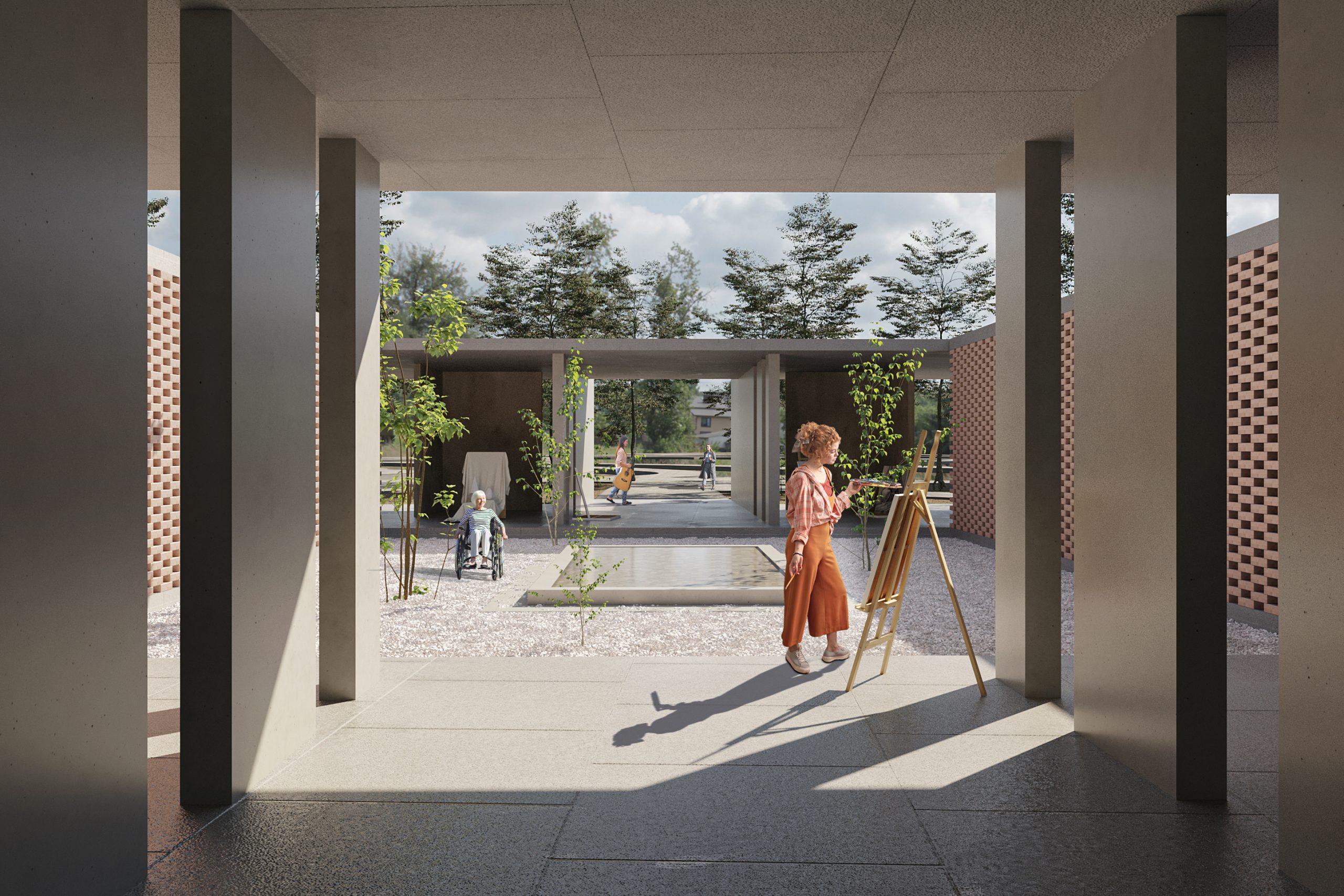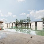 There are another flexible spaces in this complex, including an outdoor pool located in the western part of the site. The pool is spacious in the middle and has flexible walls, which allows for the possibility of enclosing it during hot seasons for swimming and opening it up to connect the inside and outside spaces during cold seasons. The pool area has a beautiful view and is suitable for all seasons. One of the key features of this outdoor pool is its minimum enclosure, maximum privacy, and security, which is achieved by using walls, canopies, and trees to block the view from the buildings around it.The garden area has been designed keeping in mind the needs of people of all age groups and abilities. Ramps and low stairs have been included to make it easy for the elderly, children, and disabled to move around. There are attractive elements in all routes to encourage people, especially women, to walk and relax. Pedestrian and bicycle paths have also been included for people to enjoy nature. Sustainable materials like wood, brick, and concrete have been used to ensure the stability of buildings and compatibility with the environment. The use of colored glass and solid walls adds to the beauty of the area. The space around the walls has been turned into an educational space. This approach has been followed to design the complex.