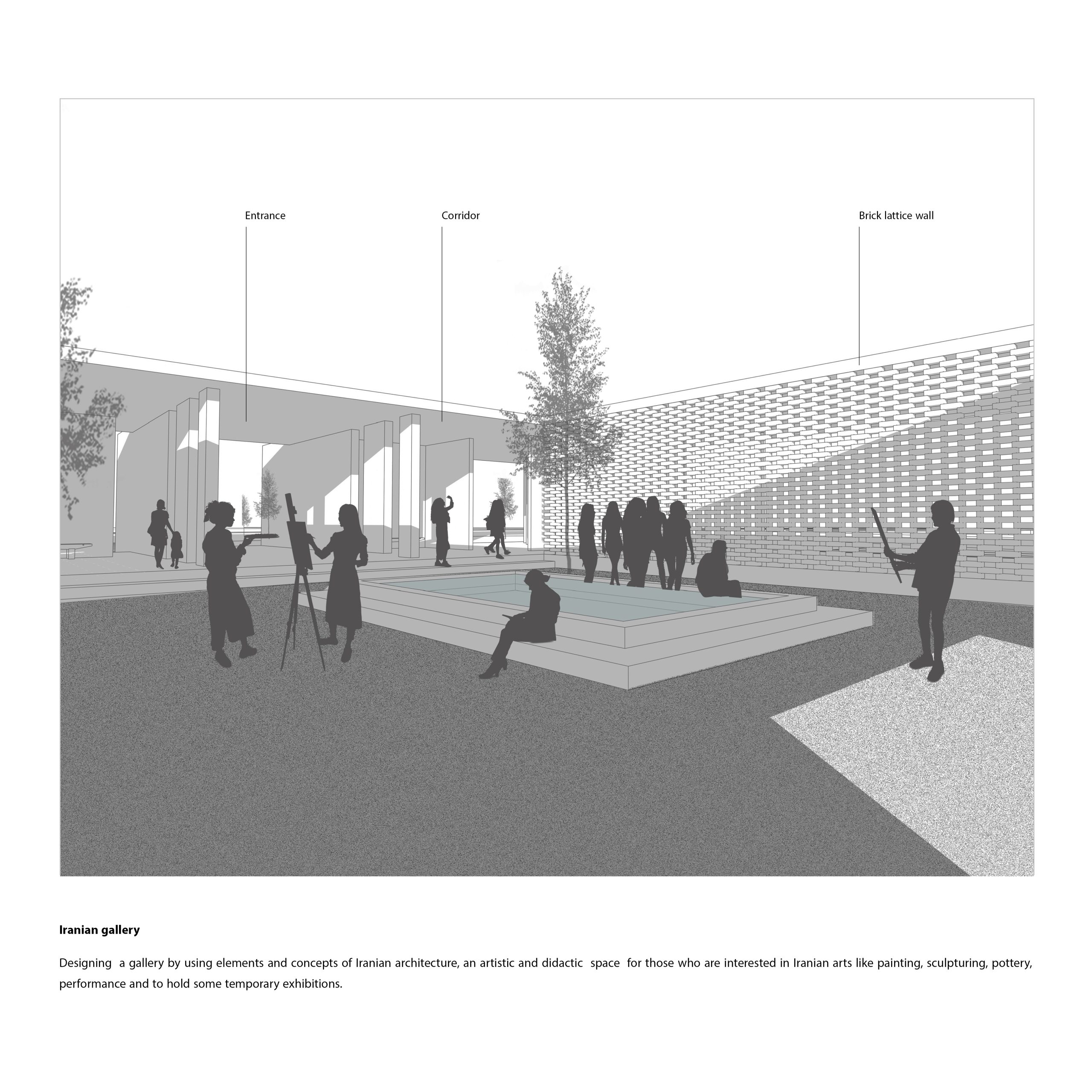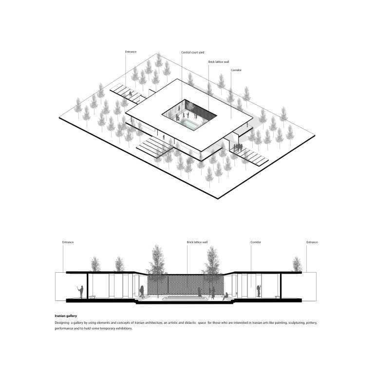 There is a gallery located in the garden, designed to meet cultural and educational needs. The space is specifically designed to introduce visitors to Iranian culture and art, with inspiration from Iranian architecture and innovative designs that represent identity. The project has been transformed into an extroverted and transparent space that invites people inside and provides a sense of peace and security with its enclosed space. The outer part is blended with nature, and natural elements such as water and plants are incorporated into the design.