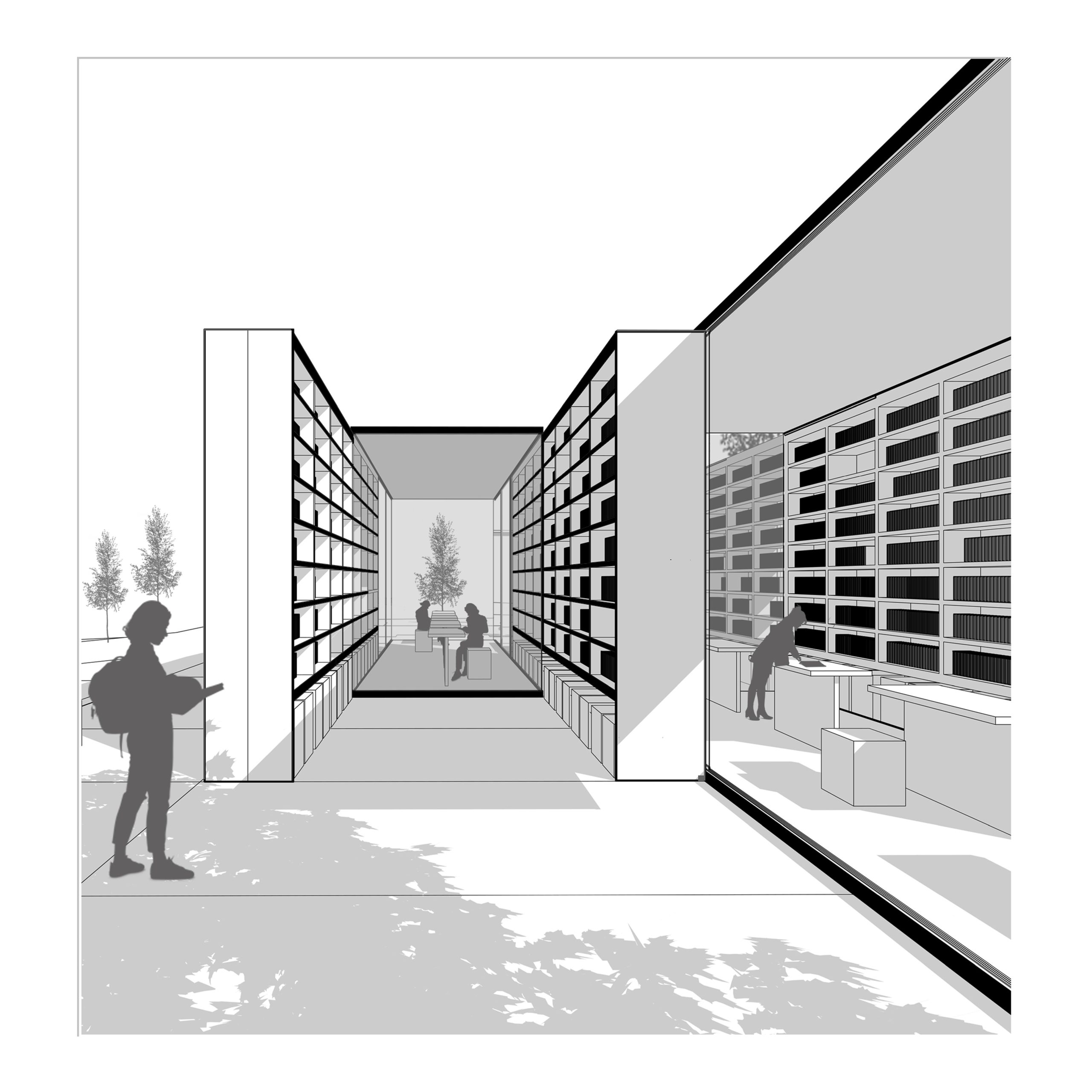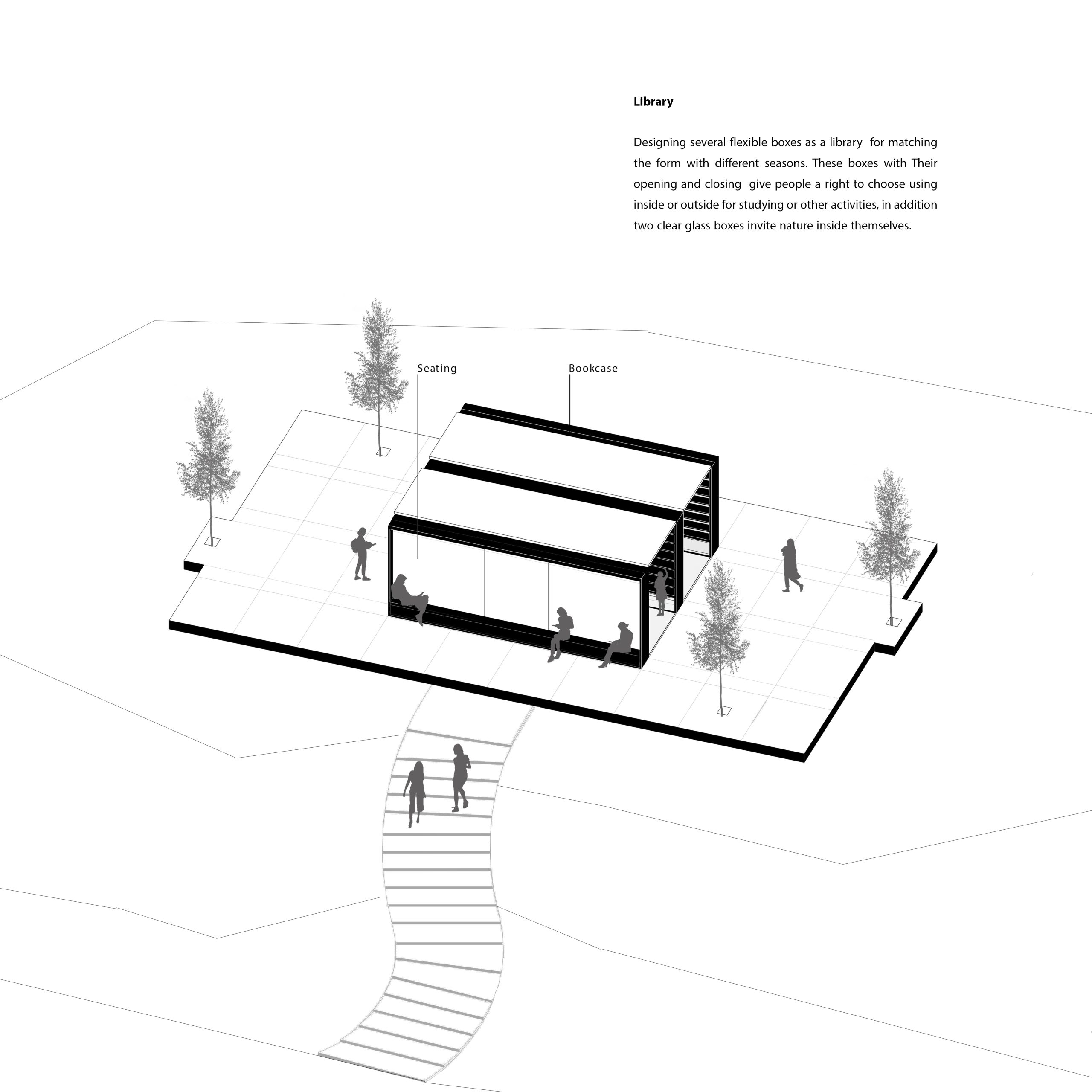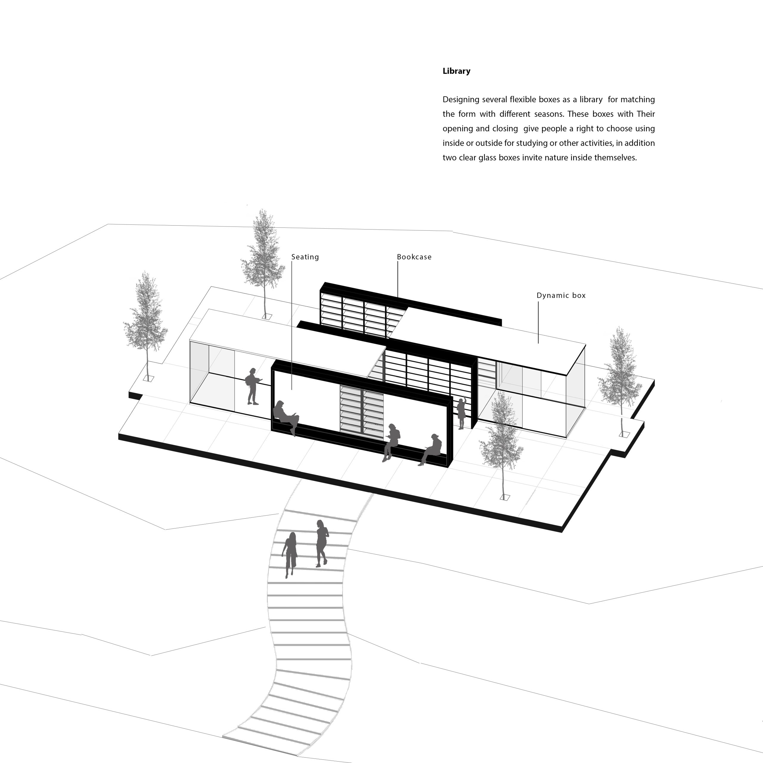 To incorporate an educational space in the garden without constructing any roofed areas, a library is proposed to be built with a lightweight, flexible, and transparent structure that blends in with nature. The library will be located in a secluded area away from the bustling activity of the site. The design will be spatially flexible, allowing the audience to choose between reading inside or outside the library, with the option to open or close the structure to adapt to different seasons. Placing the library in the middle part of the site, amidst natural topography, will provide the peace and quiet needed for studying, away from the noise and crowds of other parts of the site. The use of moving glass boxes will convey the feeling of being in nature to the audience and integrate the indoor and outdoor spaces.